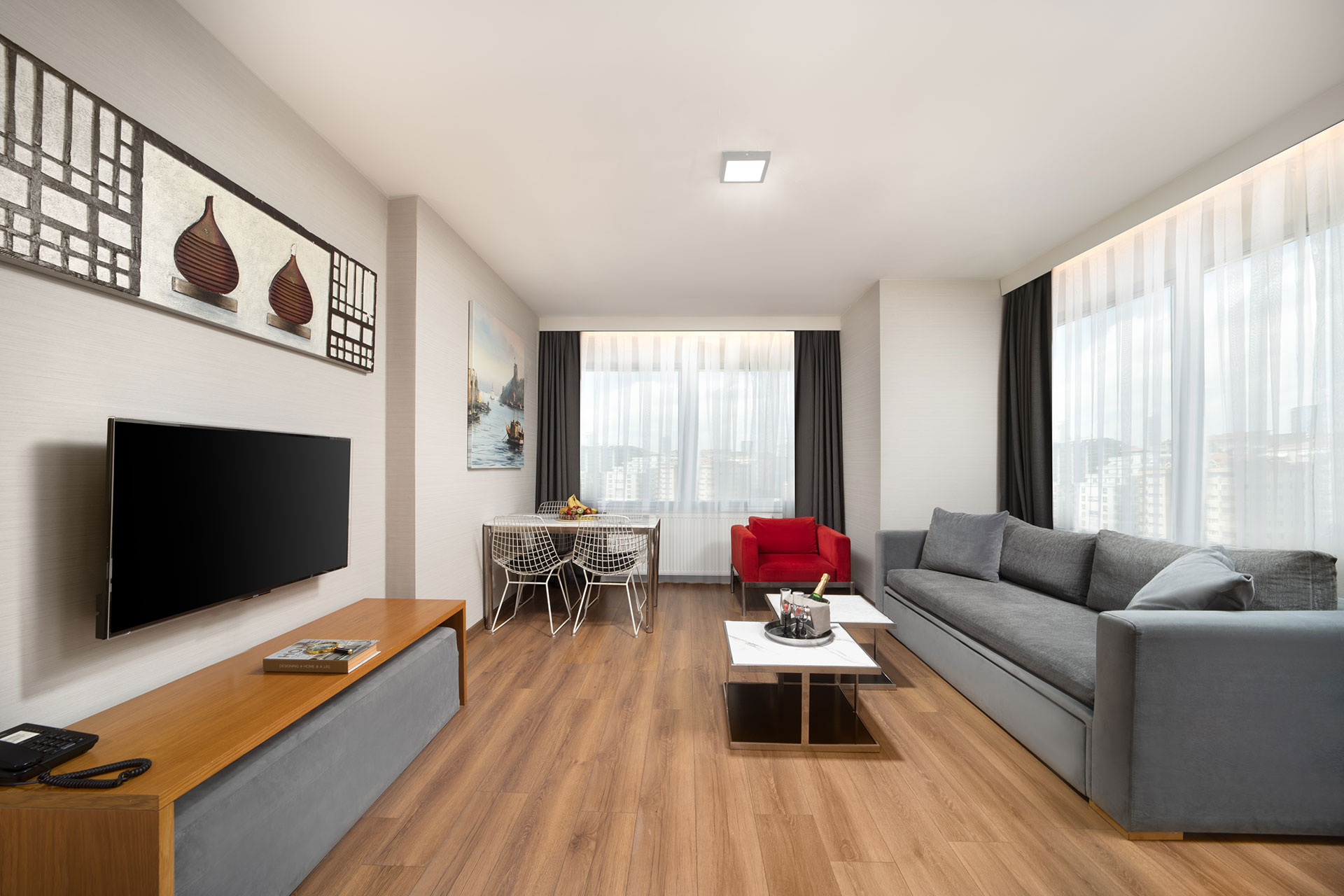 Deluxe Suite 1+1 plana ve 60 m² büyüklüğe sahiptir. Çift kişilik yatağa sahip iki bağımsız odadan oluşmaktadır. Salon kanepe takımı yatak olma özelliği vardır. SMART TV, mini buzdolabı mutfak ve mutfak araç gereçlerine sahip ve 4 kişilik yemek masası takımı bulunur. 3 kişiye kadar rahatlıkla konaklayabileceğiniz ayrıcalıklı süit odalarımızdan biridir. Ferah, büyük ve bağımsız 2 odasıyla uzun ve kısa dönem konaklama ihtiyacınız için ideal konaklama imkanı sunar. Ataşehir süit oteller arasında, merkezi konumun yanında aile boyu, konforlu konaklama deneyimini yaşamak için ilk tercihiniz olabilir.
